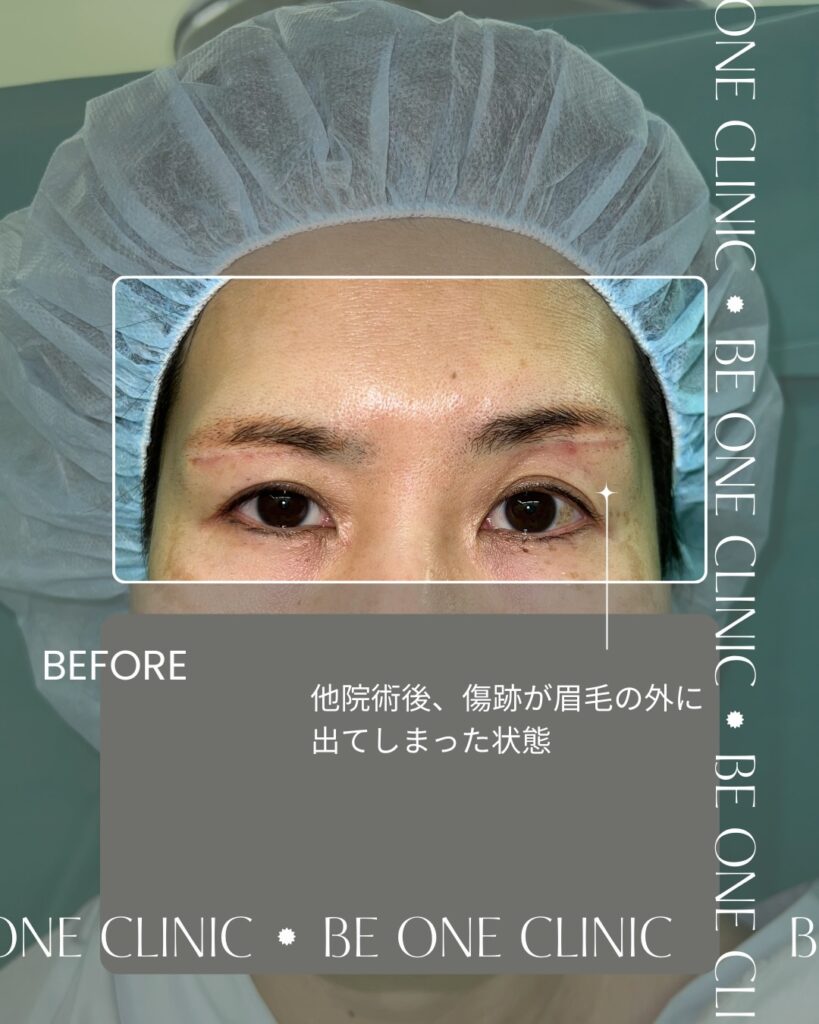 傷が眉毛の外に出てしまった症例。